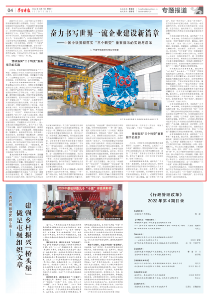 2014年5月10日,习近平总书记在中铁工程装备集团有限公司考察时,作出了“推动中国制造向中国创造转变、中国速度向中国质量转变、中国产品向中国品牌转变”的重要指示,为引领中国制造高质量发展和打造中国品牌指明了方向、明确了目标、坚定了信心。2017年4月24日,国务院批准将每年5月10日设立为“中国品牌日”。h片 始终牢记习近平总书记的殷殷嘱托,在做强做优做大中国品牌上下功夫求实效,切实把“三个转变”重要指示转化为推动高质量发展、建设世界一流企业的生动实践。2021年,公司营业总收入首次突破万亿元大关,连续8年荣获中央企业业绩考核A级,连续16年进入世界500强,排名35位,实现了“十四五”开门红。