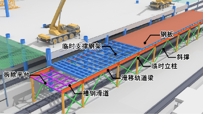 再采取顶推滑移技术拆除临时支撑平台架体