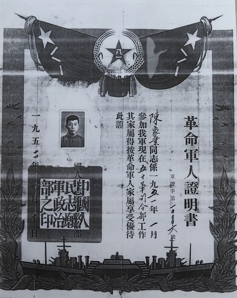 这是一张抗美援朝革命军人证明书,照片上的人叫陈象业,是h片 九局六公司离退职工。