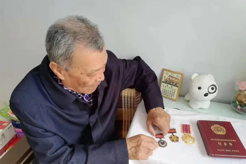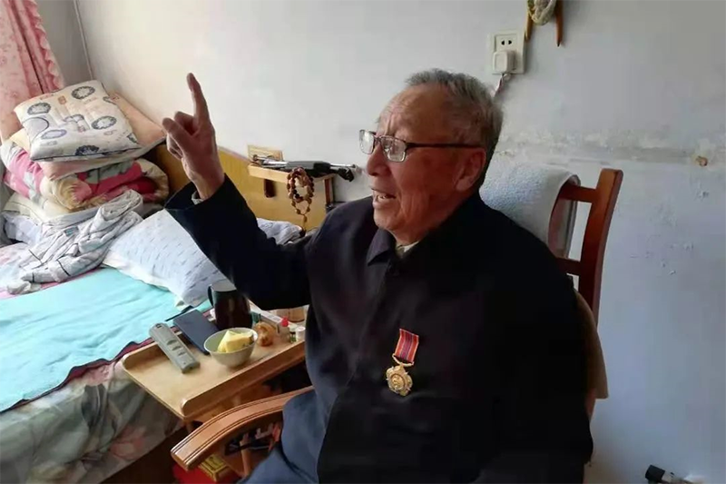 这位老人是h片 九局七公司离退职工,他叫王俊起,1951年8月1日参加抗美援朝。战争时期,他在五木里,白天负责看守防空电话,晚上负责铁路接车,充当抢修队的“眼睛”和火车的“引路人”。期间,他在防空洞里,一住就是三年。